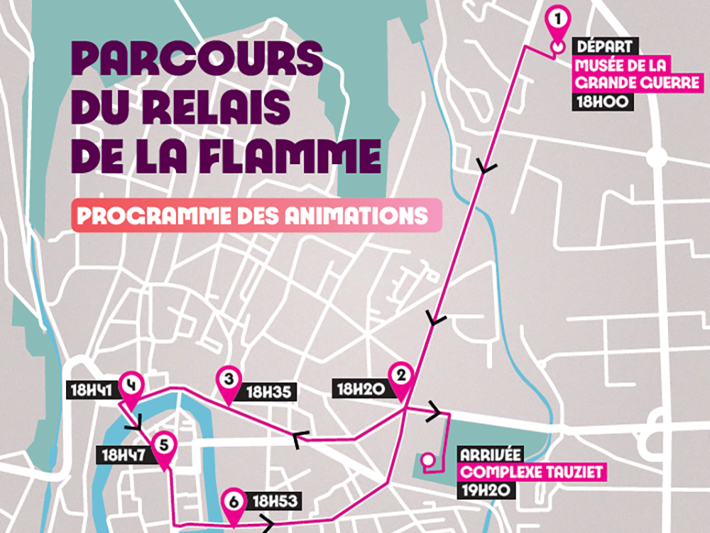 The torch route will begin at 6pm at the Musée de la Grande Guerre, accompanied by a concert and entertainment for children. The flame will then pass through several key points in the city, offering a variety of shows. At 6:20 p.m., the flame will arrive at Carrefour de l'Octroi, where the POM POM CHANN company will present a batucada and capoeira demonstration. At 6:35 p.m., it will reach Quai Jacques Prévert, where the company Les Enjoliveurs la Fiesta will present a theatrical and musical performance. At 6:41 p.m., on the Pont Jean Bureau, the Art Évolution company will perform an Olympic stilt-walker show. At 6:47 p.m., the Parvis du Théâtre Luxembourg will host rollerblading, scooter and skateboard demonstrations and initiations by the Ride Event association, accompanied by musical entertainment by DJ Pitcha. Finally, at 6:53 p.m., a participatory flash mob organized by Meldois dance schools and Olympic anthems created and sung by pupils from the city's elementary schools will round off the route before the finish at the Tauziet sports complex at 7:20 p.m.