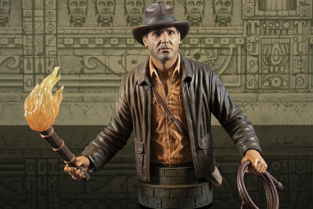A Gentle Giant LTD release! Adventure has a name, and it's Indiana Jones! Now, the legendary archaeologist swings into the Gentle Giant LTD world with a realistic 1/6 Scale Mini-Bust! Measuring approximately 6 inches tall, torch and whip in hand, this San Diego-exclusive, sepia-tinted bust is limited to only 1,000 pieces and comes packaged in a full-color box with a numbered certificate of authenticity. Plus, get a free enamel pin of an Indiana Jones Jumbo figure when you buy at the show! SRP: $130.00