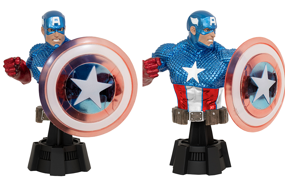 A Diamond Select Toys release! Captain America is ready to show off his big, big energy! As seen in the 2000s issues of his solo series, when his vibranium shield was shattered, Captain America wields his SHIELD-supplied energy shield in this new variant mini-bust! With a metallic sheen to his costume and a translucent resin shield to allow the light to pass through, this 1/7 scale mini-bust stands approximately 6 inches tall and is limited to only 500 pieces. It comes packaged in a full-color box with a numbered certificate of authenticity. Designed by Nelson X. Asencio, sculpted by Juan Pitluk! SRP: $70.00