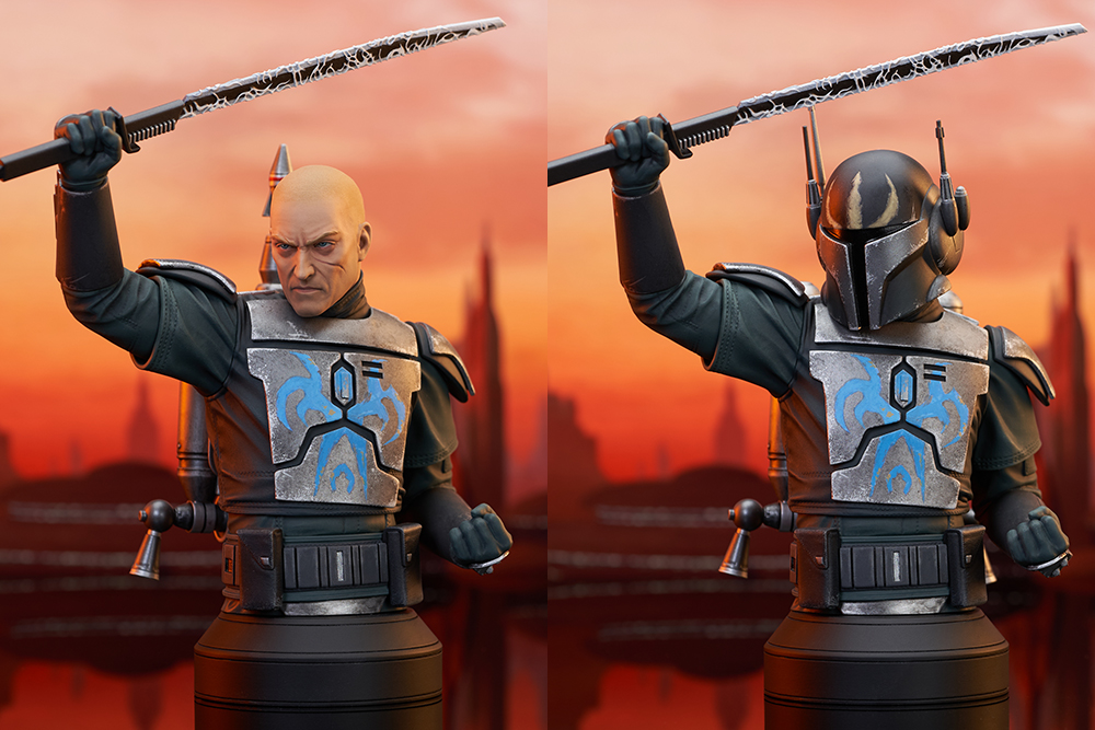 A Gentle Giant LTD release! The leader of the Death Watch has arrived! Pre Vizsla, governor of the moon Concordia and secret leader of the famous Mandalorian commando group, is now the latest 1/6 scale mini-bust from Gentle Giant LTD! Raising the darksaber and measuring approximately 7 inches tall, this exclusive mini-bust features interchangeable helmeted and unhelmeted heads. Limited to only 750 pieces, it comes packaged in a full-color box with a numbered certificate of authenticity. SRP: $130.00