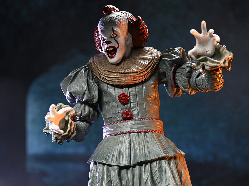 Now, NECA’s new Ultimate Pennywise celebrates this latest incarnation while honoring the myth’s deeper roots. The sculpt mirrors the 2017 and 2019 films’ monstrous elegance: the cracked forehead, the ruffled silvery-gray suit, and that iconic smile which feels as if it could stretch forever. The accessories speak to both lore and carnage — a bloody ruffle and the severed head recall the creature’s shapeshifting sadism. It’s more than a toy; it’s a tactile study of one of pop culture’s most psychologically loaded monsters. In a sense, NECA’s release coincides poetically with It: Welcome to Derry, the upcoming HBO prequel series that aims to explore Pennywise’s beginnings, expanding his mythology and the curse that grips the town of Derry.