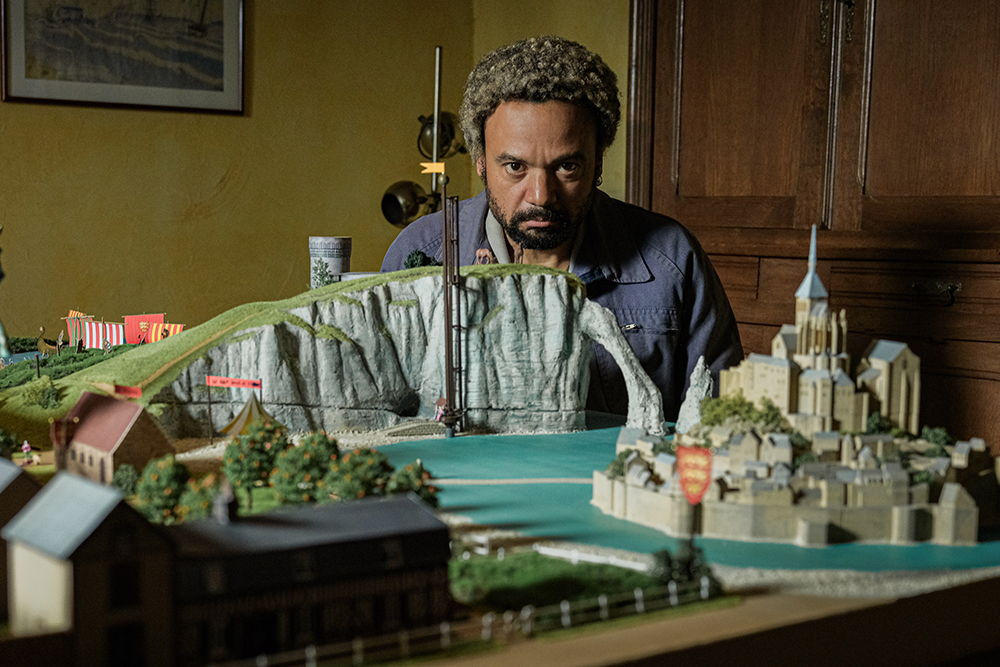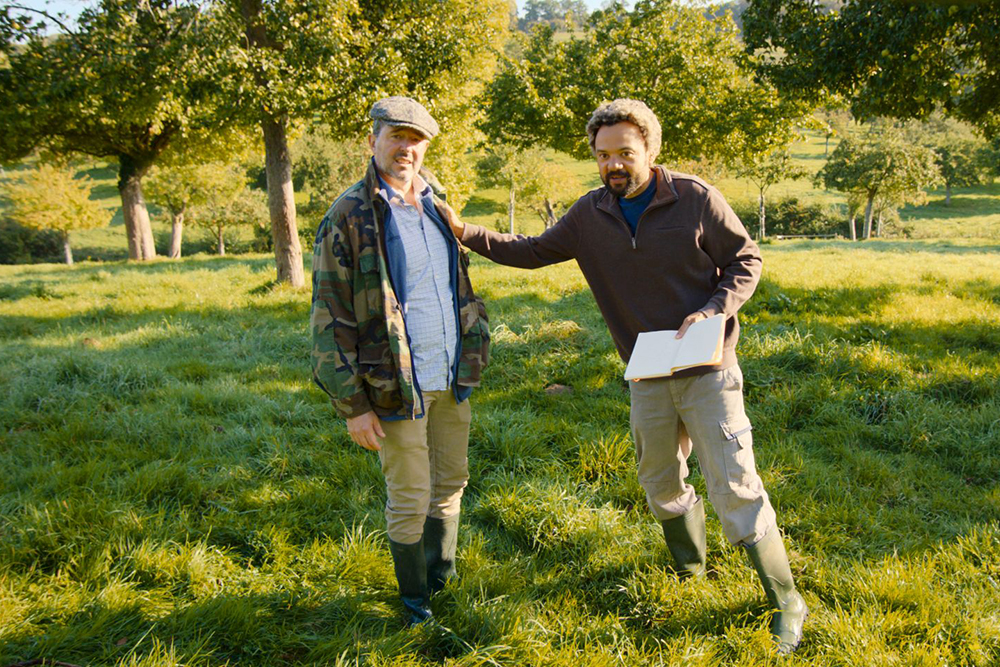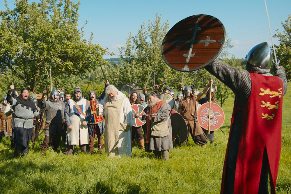 Just look at the poster—the one where Fabrice Éboué poses in red underpants in front of Mont-Saint-Michel—to sense that Gérald the Conqueror will be a film that refuses to take half measures. Behind its appearance as a schoolboy comedy, Fabrice Éboué's fifth feature film, written with Thomas Gaudin, produced by Julien Deris and David Gauquié, and distributed by Wild Bunch, is actually a mockumentary that is much more corrosive than it seems. The film follows Gérald, a Norman by adoption obsessed with the idea of restoring the region's reputation by building the largest historical park in France, dedicated to William the Conqueror. A delusional ambition that will lead him to the darkest extremes of identity radicalization. The film was shot in the Île-de-France and Normandy regions (Bayeux, Caen, Lisieux, Pont-l'Évêque), giving it an authentic, almost documentary feel that reinforces the satirical tone of this portrait of a man who dreams of being a local hero but slips into madness in his desire to be “more Norman than the Normans.” What is immediately striking about the genesis of the project is Fabrice Éboué's personal attachment to the region)