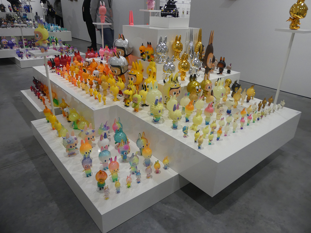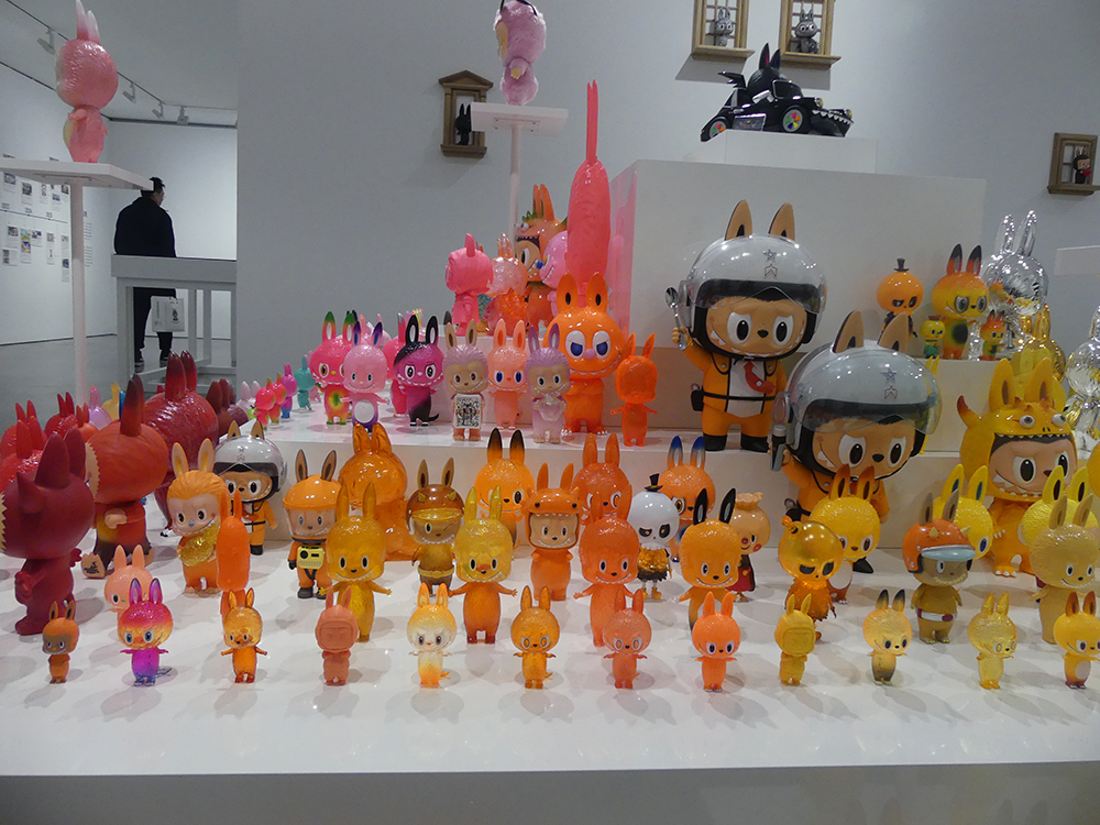 Une chronologie retrace également la collaboration entre Kasing Lung et le studio de création How2work, qui a joué un rôle essentiel dans la transformation des personnages illustrés en figurines de designer. Si les premières explorations dans ce domaine remontent au début des années 2010, c'est vraiment à partir de 2019 que l'univers The Monsters a commencé à s'étendre à l'international grâce à un partenariat avec POP MART, la société chinoise fondée en 2010 à Pékin par Wang Ning. La marque s'est rapidement imposée comme un acteur majeur sur le marché des jouets design grâce à son modèle de distribution basé sur les célèbres « blind boxes », des boîtes surprises qui transforment l'acte d'achat en une expérience alliant hasard, rareté et collection. Ce système a largement contribué à l'engouement mondial autour de Labubu, créant une véritable culture de collection alimentée par la surprise et la recherche de pièces rares.
