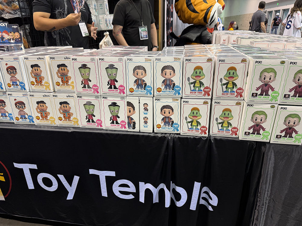 La gamme de produits elle-même offrait un aperçu révélateur de la stratégie de Thrilljoy, une stratégie qui s’aligne étroitement sur les tendances confirmées du secteur, soulignant la prédominance des collectionneurs adultes — souvent qualifiés de « kidults » — dans la croissance du secteur mondial du jouet, en particulier dans les catégories sous licence et en série limitée. Des personnages tels que Marty McFly, Invader Zim, le Joker et Dig ‘Em Frog, tous visibles sur les présentoirs du stand, témoignent d’un mélange calculé de nostalgie culte et de reconnaissance grand public, garantissant que plusieurs générations de fans puissent trouver un point d’entrée dans le catalogue de la marque. Cet attrait intergénérationnel n’est pas le fruit du hasard, mais reflète une évolution plus large documentée par des analystes de marché tels que Circana, qui a souligné à plusieurs reprises comment les comportements d’achat motivés par la nostalgie sous-tendent désormais une part significative des ventes d’objets de collection. Thrilljoy s’appuie sur cette dynamique avec le format PIX! — des figurines compactes et stylisées souvent liées à des séries numérotées ou à des variantes exclusives —, transformant chaque article à la fois en objet de collection et en actif potentiel sur le marché secondaire, une réalité dont les habitués des salons sont parfaitement conscients lorsqu’ils passent d’un stand à l’autre à la recherche de la prochaine perle rare.