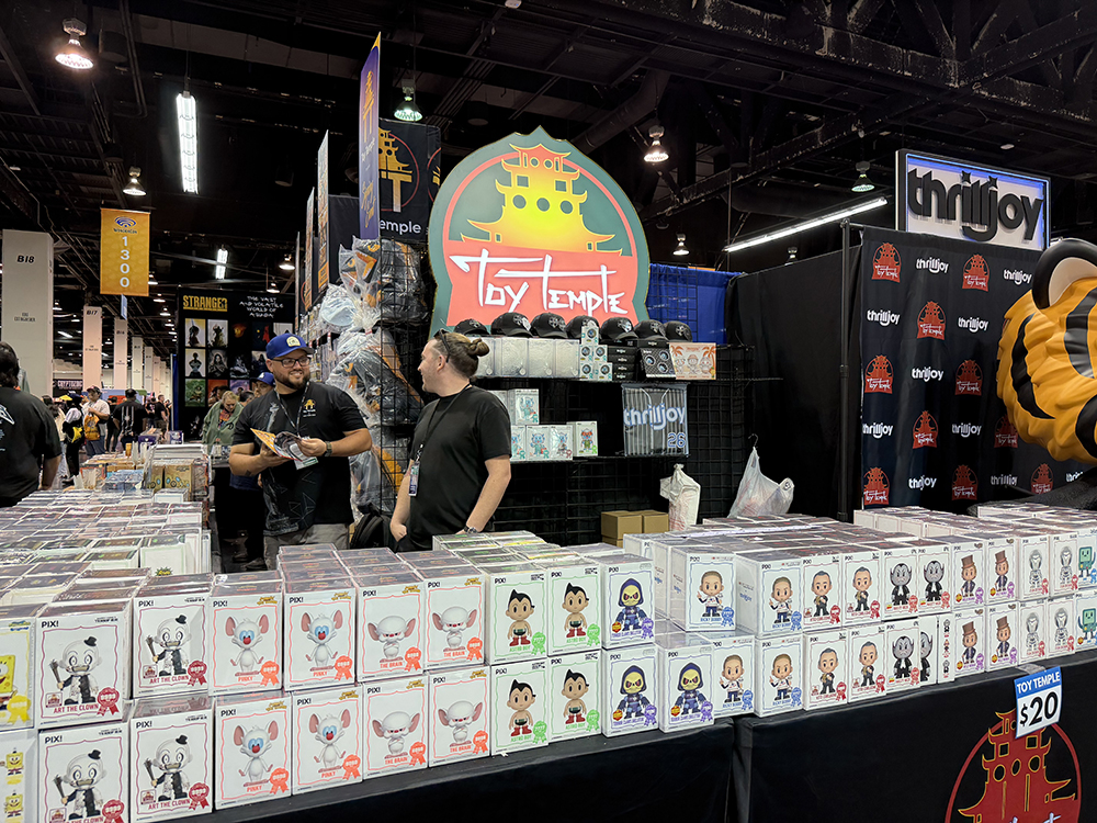Au WonderCon 2026, où le salon s'est une fois de plus révélé être un champ de bataille pour attirer l'attention entre les grands studios, les marques de jouets traditionnelles et les nouvelles entreprises de collection, Thrilljoy a réussi à s'imposer avec une présence à la fois réfléchie et discrètement dominante, non pas uniquement grâce à son envergure, mais grâce à une compréhension précise de ce que les collectionneurs d'aujourd'hui recherchent réellement lorsqu'ils pénètrent dans un espace comme celui-ci. Le stand, géré en collaboration avec Toy Temple, s’est immédiatement démarqué grâce à sa présentation dense mais épurée des figurines PIX!, disposées en longues rangées presque hypnotiques qui créaient un rythme visuel impossible à ignorer, attirant les visiteurs avec la promesse d’exclusivité et de découverte. Ce que ces photos capturent particulièrement bien, c’est ce mouvement constant autour des tables — des fans se penchant, scrutant les boîtes, signalant des variantes — une chorégraphie organique qui reflète l’état actuel du marché des objets de collection, où le simple fait de parcourir les produits est devenu aussi important que l’achat lui-même, surtout dans un contexte où les éditions limitées et les sorties exclusives aux salons suscitent à la fois un sentiment d’urgence et un investissement émotionnel.
