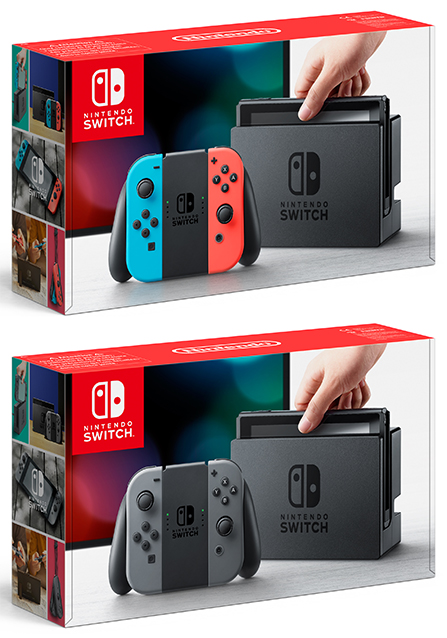 Dans la boîte, on trouvera : une console, les manettes Joy-Con (L) et Joy-Con (R), un support Joy-Con (sur lequel les deux Joy-Con peuvent être combinés afin de former une seule manette), deux dragonnes Joy-Con, une station d'accueil Nintendo Switch (qui maintient la console et la connecte au téléviseur), un câble HDMI et un adaptateur secteur Nintendo Switch. Deux versions de la console seront proposées : une version contiendra deux Joy-Con gris, et l'autre version disposera d'un Joy-Con rouge néon et d'un Joy-Con bleu néon.
