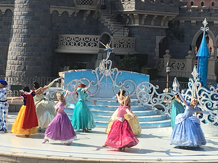 D’un coup de baguette magique, la Fée Clochette a transformé la scène du Théâtre du Château, aux délicates arcades ajourées, en une salle de bal étincelante, où valsent les Princesses Disney. Aurore, Ariel, Belle, Blanche- Neige, Cendrillon, Jasmine, Raiponce et Tiana, dans de splendides robes de bal, au son d’une fanfare romantique, promettent un moment féérique dans le décor unique du Château de La Belle au Bois Dormant et de son fabuleux ballet de fontaines. « L’une des chansons du spectacle s’appelle « Every Girl can be A Princess » et, en effet, nous avons voulu qu’au-delà des huit princesses présentes sur scène, ce soit toutes les petites filles dans le public qui se sentent aussi princesses pendant toute cette année du 25e Anniversaire », sourit Amanda Cahen, la metteur en scène.