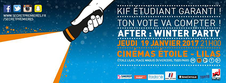 Ce Jeudi 19 janvier à 21h Secret Premières revient au Cinéma Etoile Lilas (Paris 20e Porte des Lilas) pour sa 9ème soirée de films en avant-première "secrète". Dans ce cadre cinq films en avant-première "secrète" + AFTER "Winter Party". Ce sont de VRAIES avant-premières avec des films présentés jusqu’à 10 semaines avant leur sortie en salles ! Les étudiants votent pour le film que le film qu’ils viennent de découvrir en avant-première et délivrent le kif étudiant, le premier label cinéma des étudiants. La soirée se poursuit avec un after « Winter Party » au pub Corcoran’s Lilas. Pour bien démarrer l'année, venez déguisé(e) et nous vous offrons le 1er verre ;)