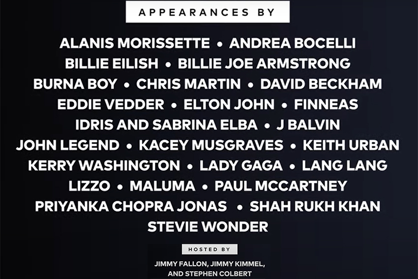Durant ce show de plus de 2 heures, Jimmy Fallon, Jimmy Kimmel et Stephen Colbert feront le lien avec une série de concerts en ligne et de nombreux artistes comme Elton John, OneRepublic, Chris Martin de Coldplay, Andrea Bocelli, Paul McCartney, Billie Eilish, Stevie Wonder, Billie Joe Armstrong, Burna Boy, David Beckham, Eddie Vedder, Finneas Idris and Sabrina Elba, J Balvin, John Legend, Kacey Musgraves, Keith Urban,Kerry Washington, Lady Gaga, Lang Land, Lizzo, Maluma, Priyanka Chopra Jonas, Shah Rukh Khan se produiront à domicile.