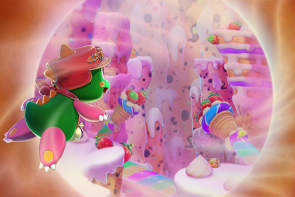 Visuellement, Bubble Bobble Sugar Dungeons est un véritable régal, même si tous les choix artistiques ne plairont pas aux puristes. Les personnages 2.5D modernisés, avec leurs proportions arrondies et semblables à celles de jouets, sont suffisamment expressifs pour que Bub reste infiniment attachant, et les mondes sur le thème des bonbons — des cavernes de sucre cristallisé aux cascades de sirop — démontrent une volonté claire d'intégrer la célèbre palette de couleurs de Bubble Bobble dans une esthétique contemporaine. Tomohito Oka a mentionné qu'il voulait éviter l'atmosphère « sombre » généralement associée aux roguelites, et cela devient évident dans chaque image : même les pièges les plus mortels semblent sortir tout droit d'une publicité pour des bonbons destinés aux enfants. La bande-son porte l'ADN typique de TAITO — des boucles énergiques avec des mélodies entraînantes — même si certains morceaux peuvent devenir répétitifs lors de longues sessions. Techniquement, le jeu est solide sur toutes les plateformes, même si la variété visuelle dans les niveaux de donjon plus profonds pourrait être plus diversifiée pour correspondre à l'escalade constante de la difficulté.