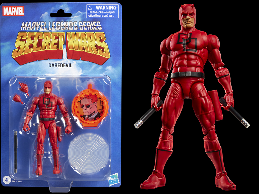 Daredevil, alias l'avocat aveugle Matt Murdock, rejoint la vague avec une figurine inspirée de Marvel's Secret Wars et des bandes dessinées classiques de Daredevil. La figurine comprend deux mains interchangeables, sa canne à crochet emblématique et une matraque qui se sépare et se reconnecte à l'aide de pièces de connexion. Des accessoires supplémentaires, tels qu'un câble et un effet radar, permettent des mises en scène orientées vers l'action. Pour compléter cet hommage rétro, un bouclier « secret » faisant référence aux figurines originales est inclus.