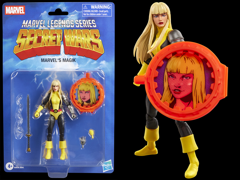 La mutante mystique Magik bénéficie du traitement Marvel Legends, inspiré des bandes dessinées Marvel's Secret Wars II, X-Men et New Mutants. La figurine comprend deux mains interchangeables, son épée mystique Soul Sword et un accessoire représentant un effet d'épée qui capture son énergie surnaturelle. Le bouclier « secret » de cette édition, inspiré des jouets originaux Secret Wars, renforce l'attrait rétro pour les collectionneurs.