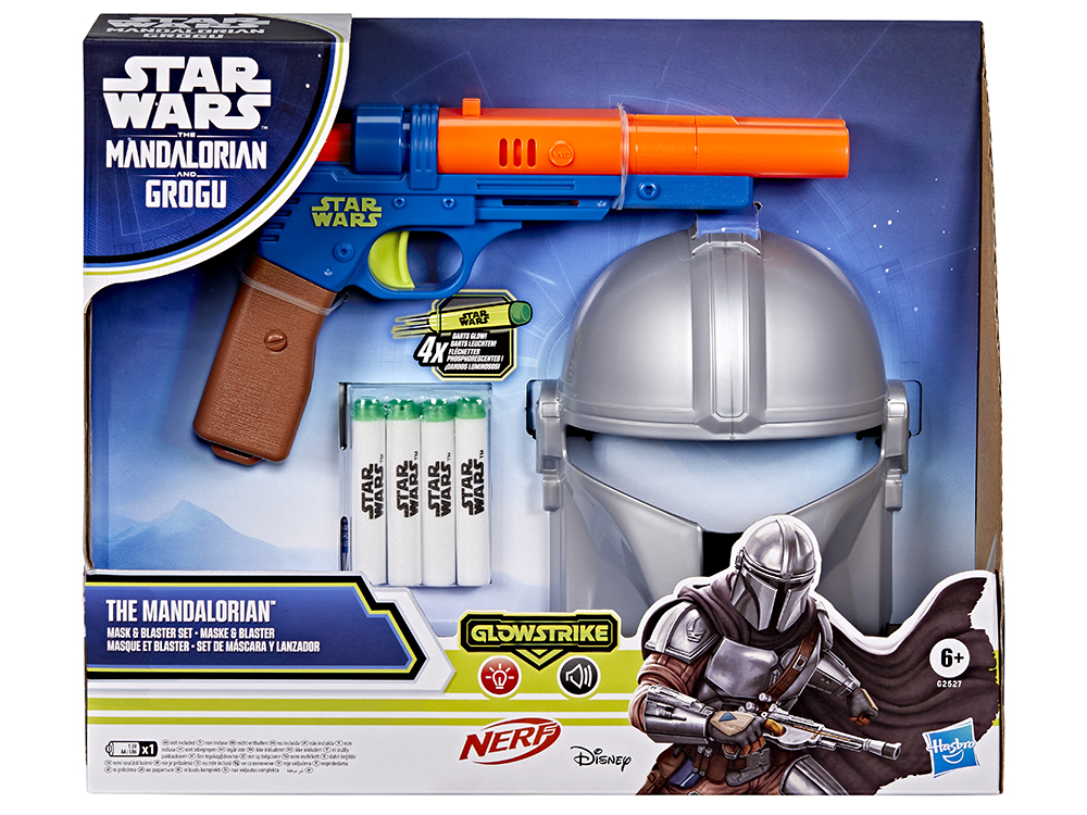 Combinant jeu de rôle et technologie Nerf GlowStrike, cet ensemble comprend un masque Mandalorien et un blaster capable de produire des effets lumineux, des fléchettes lumineuses et des sons de tir immersifs. Le blaster charge deux fléchettes, tire individuellement et comprend quatre fléchettes en mousse Nerf GlowStrike officielles. Le port de lunettes est recommandé ; une pile AA est nécessaire (non incluse).