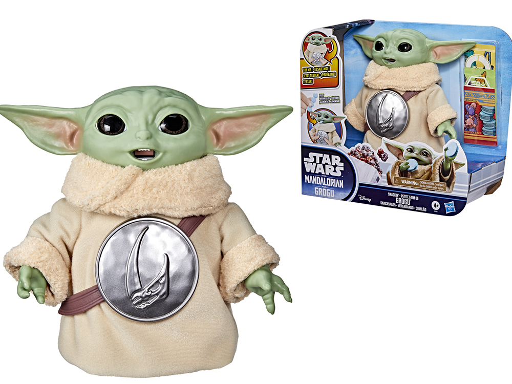 Figurine articulée Grogu avec six snacks factices, action de mastication, gadget snack disparaissant et cycle d'alimentation réutilisable.